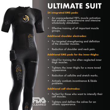 Con 24 delicati elettrodi EMS integrati, Ultimate Suit garantisce un'attivazione muscolare del 98% per una stimolazione profonda e completa di tutto il corpo. Allena tutti i gruppi muscolari in modo efficace per ottenere risultati rapidi e significativi. L'impossibile diventa realtà!